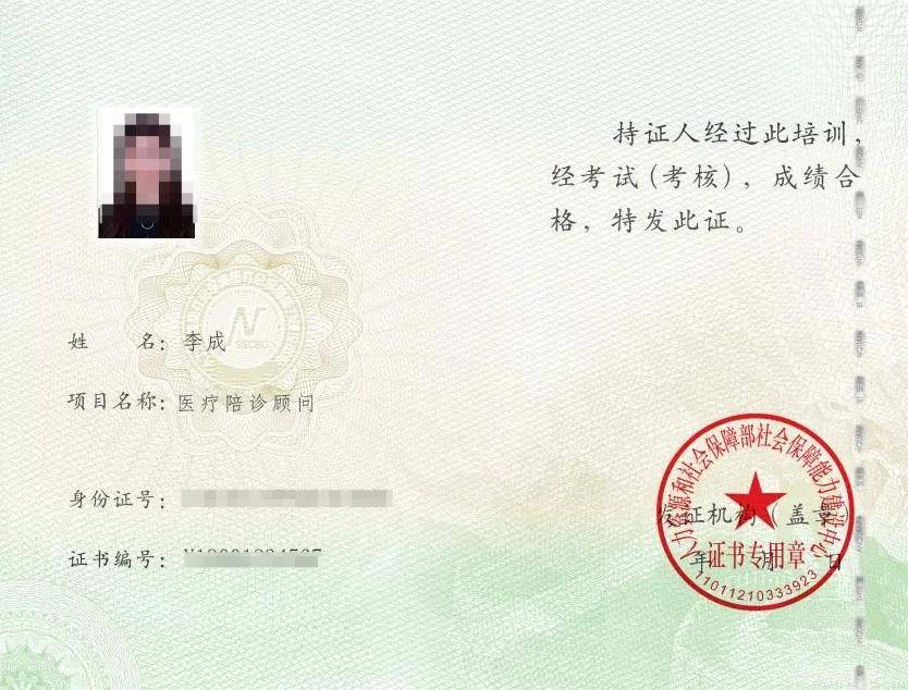 所有参加培训还考核达标的人,由人力资源和社会保障部社会保障能力建设中心发医疗陪诊顾问培训证书。